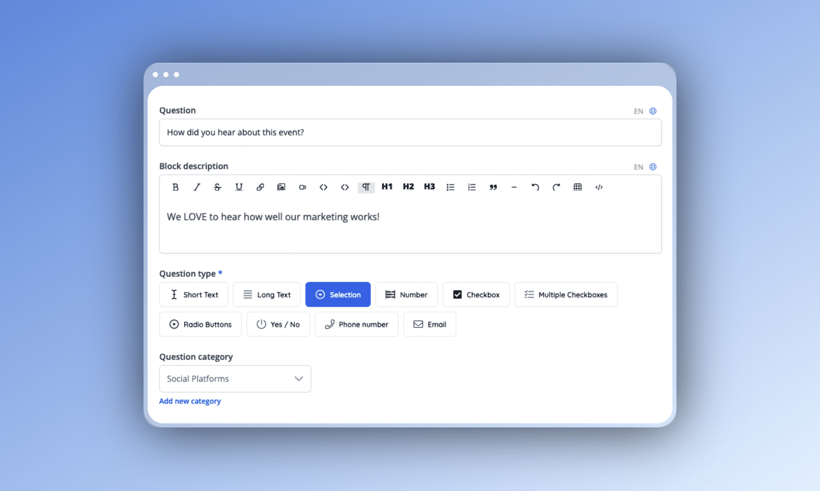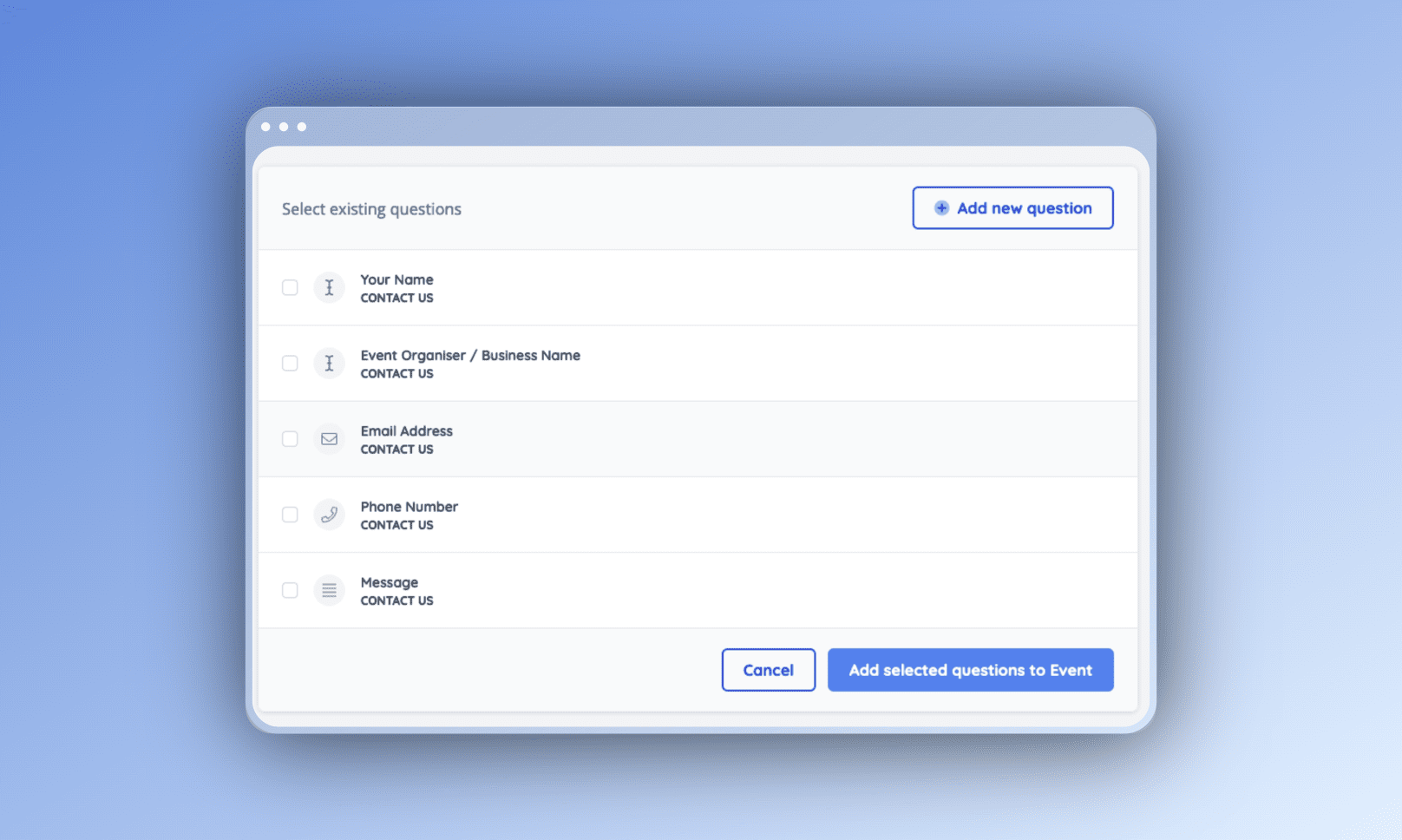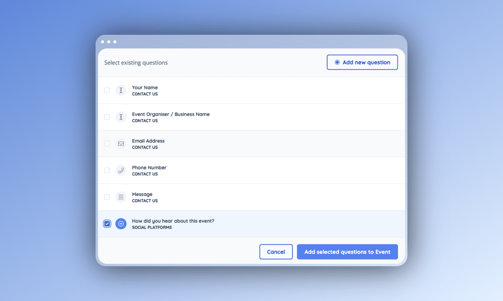 To apply the question to the event, select the "Add selected questions to Event" button.