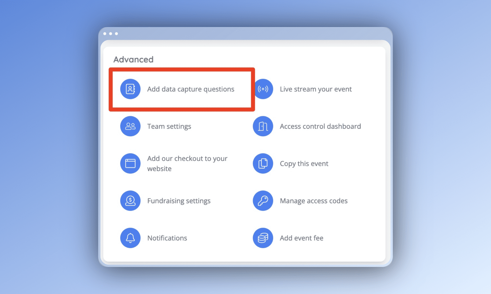 Once you've reached the "Event Dashboard," locate the "Actions" tab and select "Add data capture question"