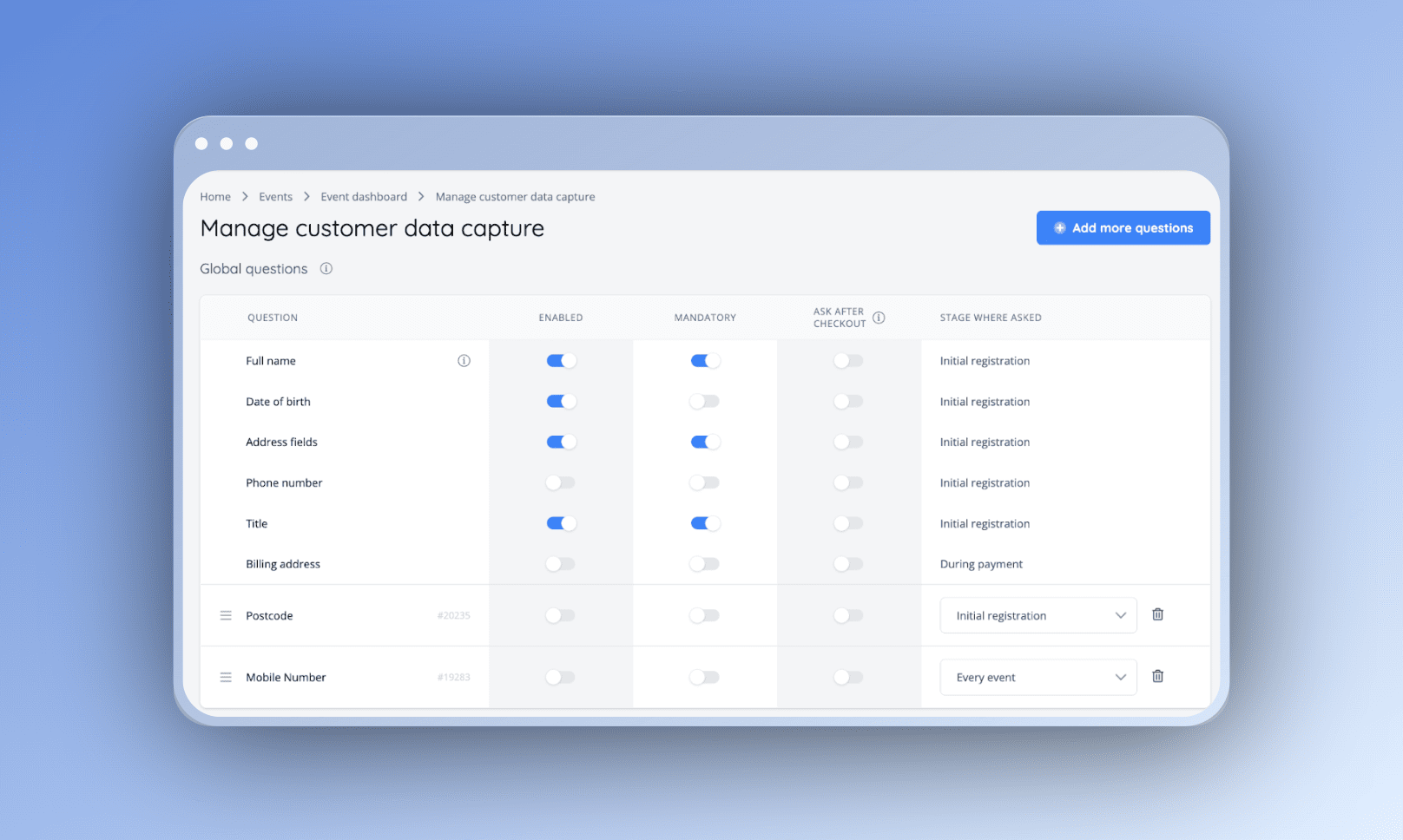 On the "Manage customer data capture" page, select the "Add more questions" button.