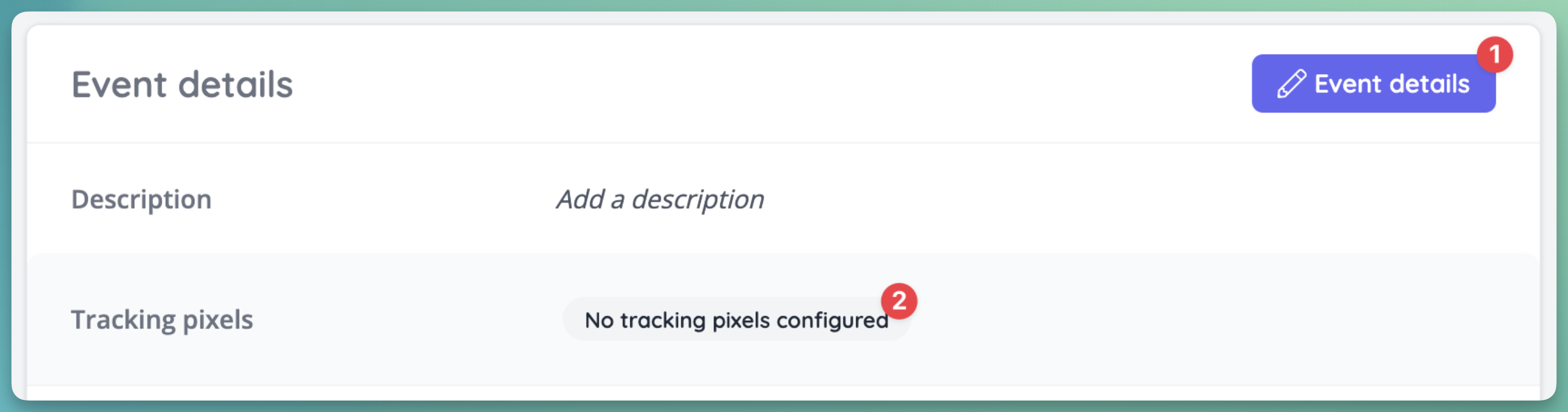 If Pixel Tracking is enabled for your company by your administrator, you will find the Tracking Pixel settings on your event dashboard. Click Event details, then the Tracking pixels row to edit.