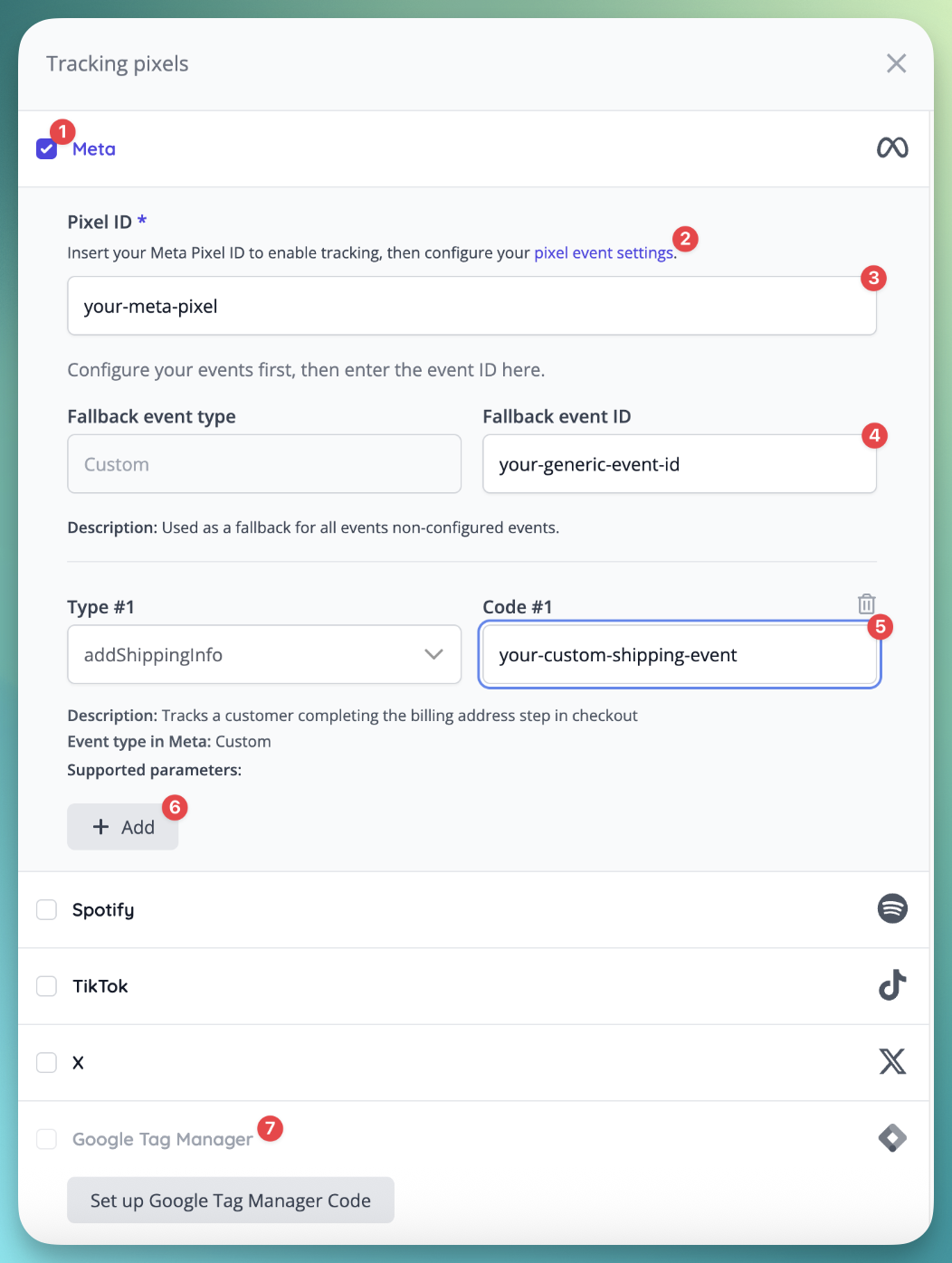 In all pixel platforms, you can create custom tracking events. Our system sends every tracking event with an identifier. Some tracking events don’t have a matching event in your given platform, so we added a fallback event ID, which will catch every event not set up by you, and pushes it to your given tracking event ID.