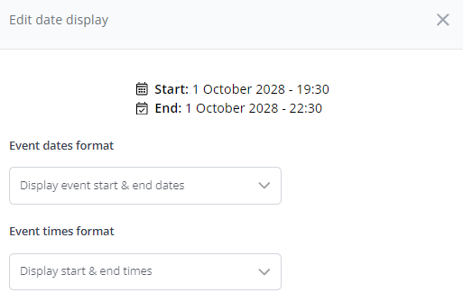 Event Date & Time Display - These options allow you to edit the way in which dates and times are displayed on your event page. Each drop-down will offer a variety of date & time display options.