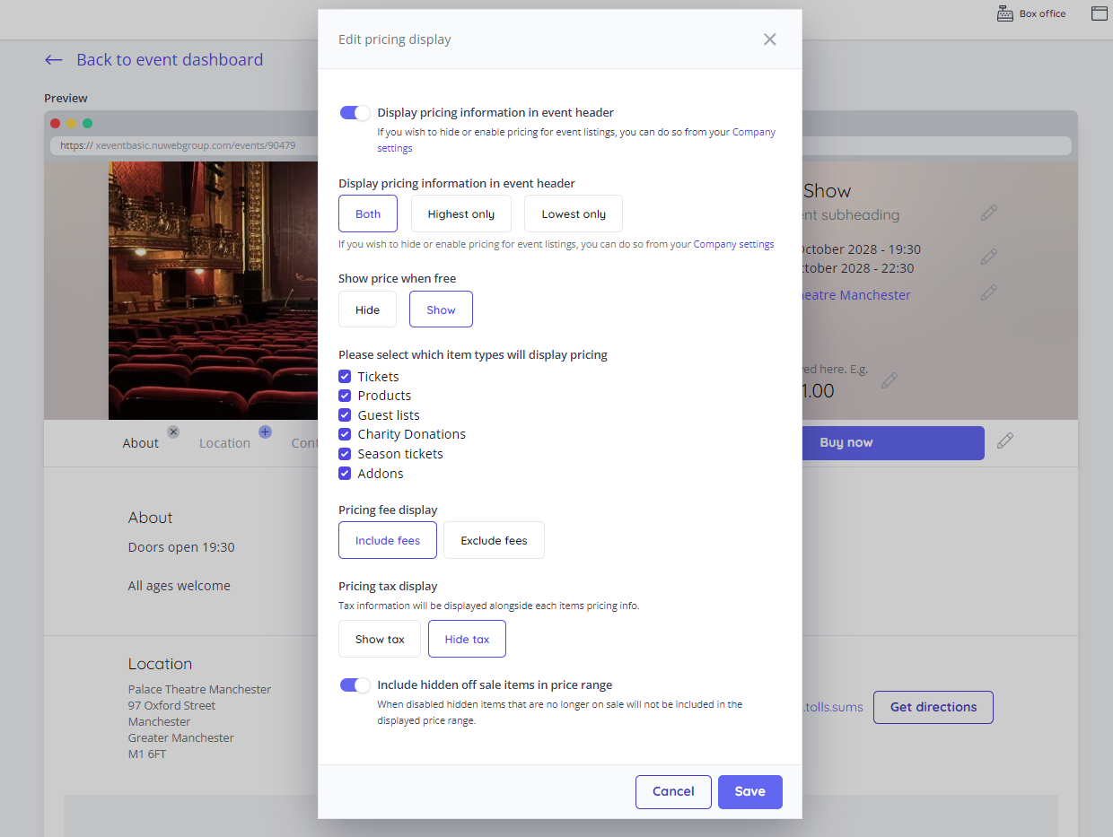 Display pricing information in the event header - Choose if the pricing range display is shown or not
