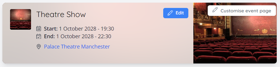 Once your event is created, all event customisation options can be found by clicking "Customise event page" next to the event title at the top of the event dashboard: