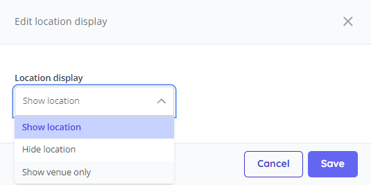 Event location display - Set whether or not the full location for your venue is displayed, or hide venue details altogether.