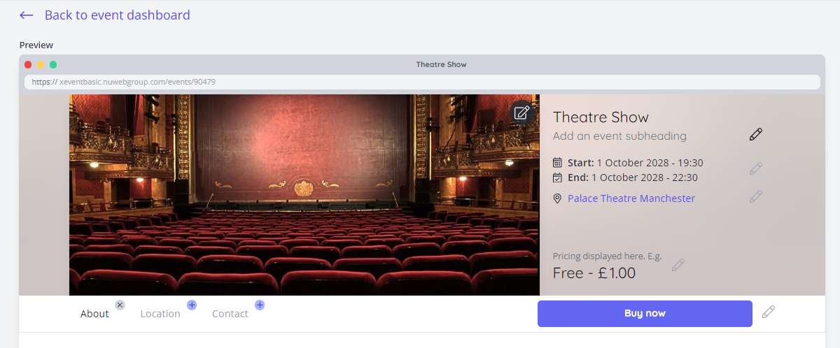 From here, most aspects of the event page can be customised to your liking. The first set of customisation options appears at the top of the page preview:
