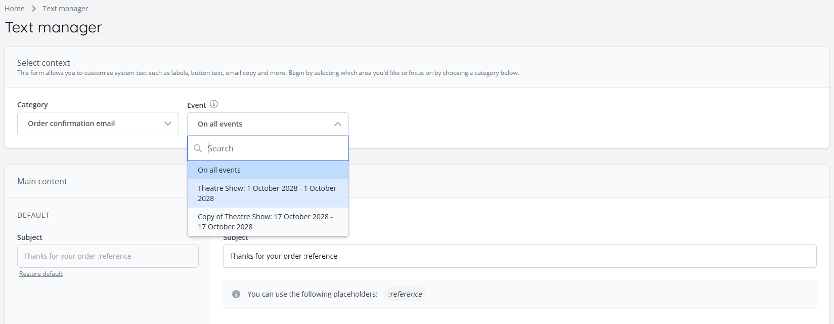 2. If you are editing an event-specific email, you can also select which events your changes apply to, using the "Event" drop-down