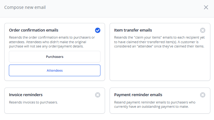 Order confirmation emails - Resend the order confirmation emails to purchasers or attendees. Attendees who didn't make the original purchase will not see any order/payment details. Recipient options are:
