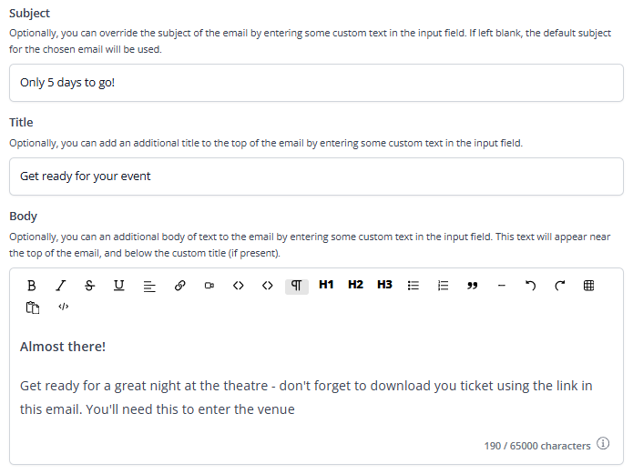 Body - An additional body of text to the email by entering some custom text in the input field. This text will appear near the top of the email, and below the custom title (if present).