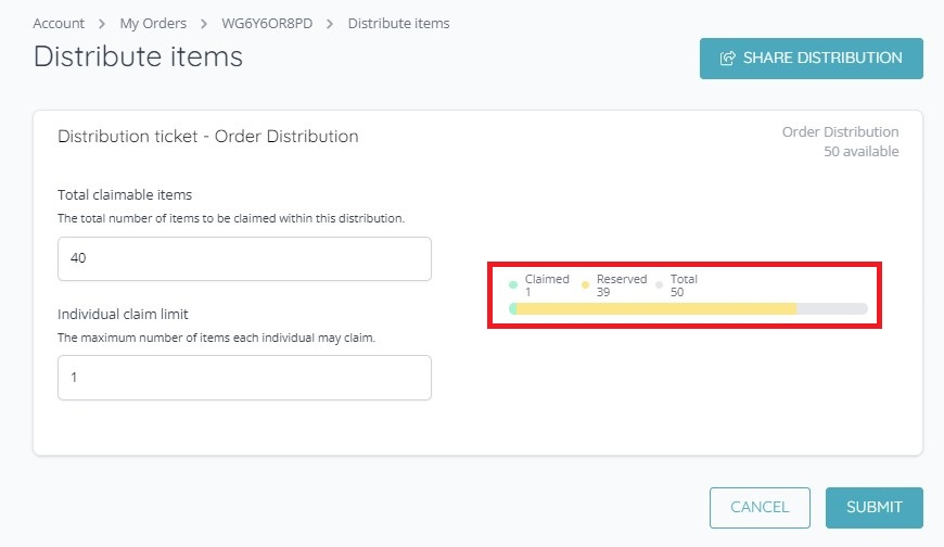 Once claimants start claiming the allocation set by the customer, this will be reflected in their customer account under “Orders > Distribute”