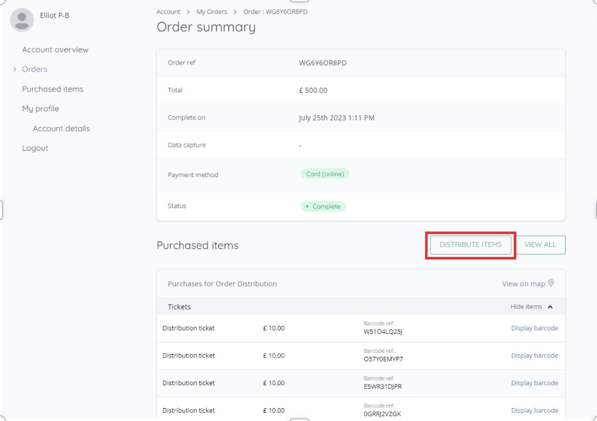 3. From “Orders”, orders of 5 or more tickets can be selected for distribution. Upon clicking on the order, there is an option above the order items to “Distribute”: