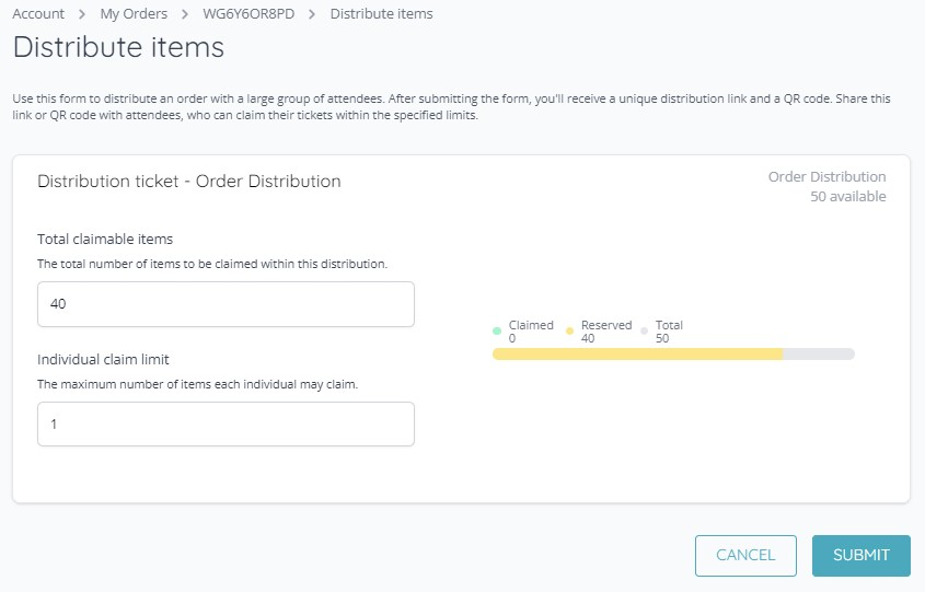 4. Click “Distribute”. From here, the customer can set a total number of claimable items and how many tickets each individual can claim: